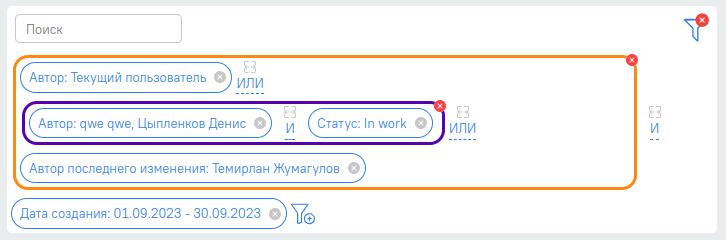 - Внутри оранжевого бракета ищем задачи, где автор либо текущий пользователь, либо Цыпленков Денис, но статус задачи In Work или Автор последнего изменения задачи Темирлан Жумагулов