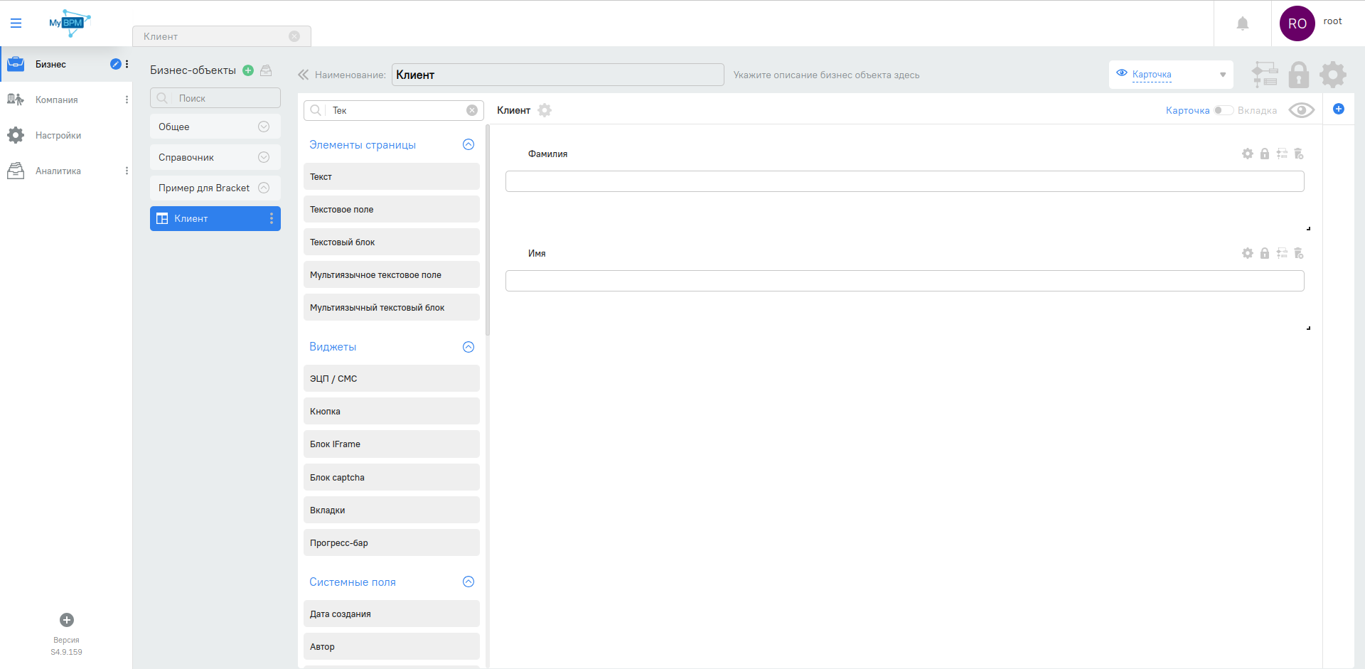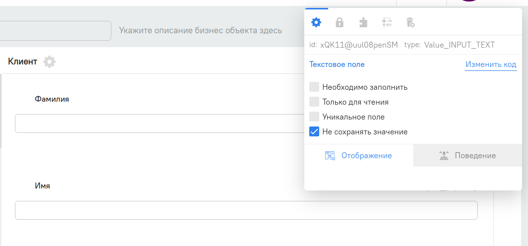 Создадим БО "Клиент" с текстовыми полями "Фамилия" и "Имя"