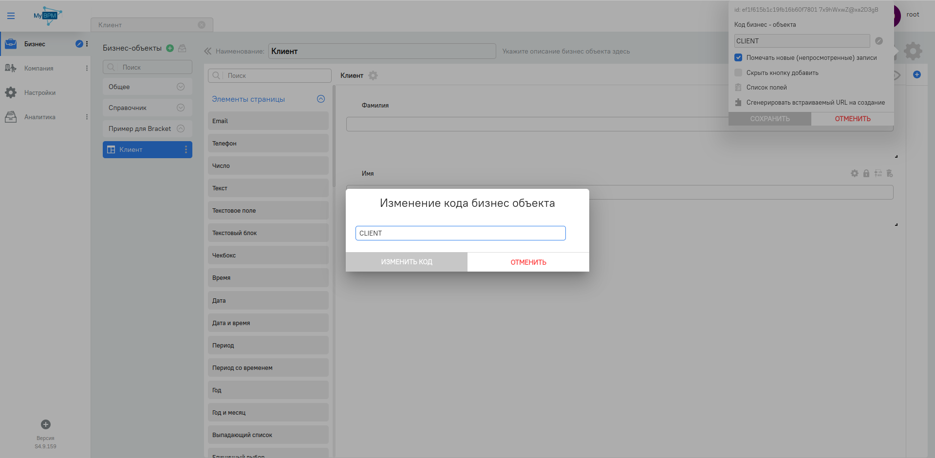 Изменим код бизнес-объекта на CLIENT (Как изменить код бизнес-объекта?)