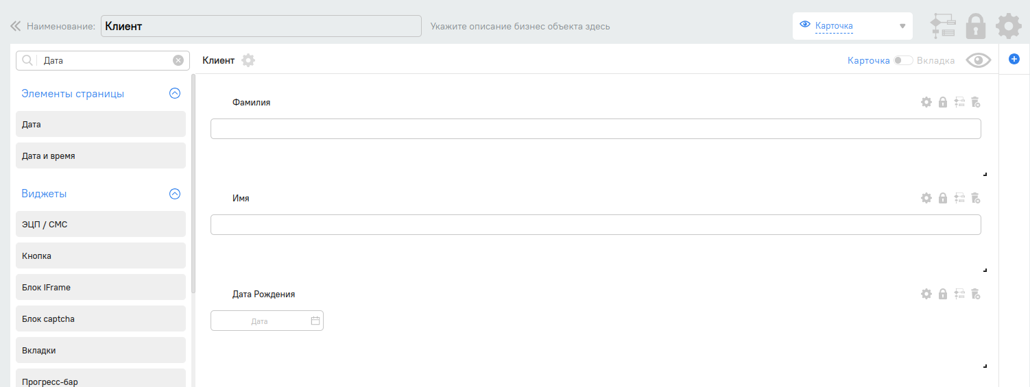 Создание БО Клиент и полей Фамилия и Имя описано в предусловии запроса примера #1