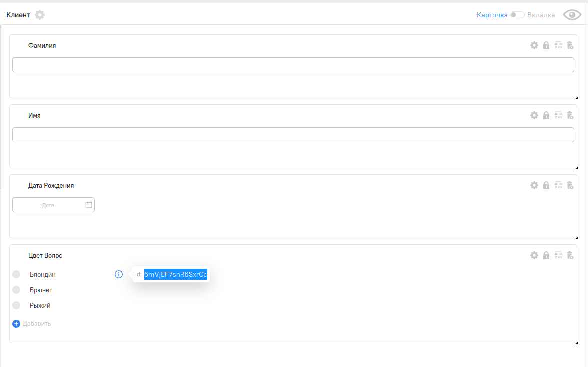 - Нажмём на шестеренки поля Цвет Волос и получим id и type: id =