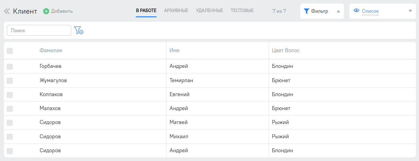 В результате получаем всех клиентов с цветом волос блондин (Горбачев Андрей, Сидоров Андрей и Колпаков Евгений):