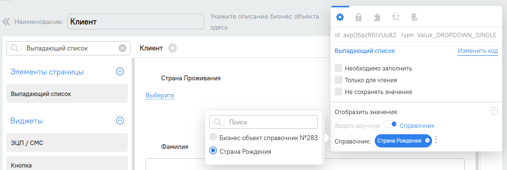 Добавляем поле "Выпадающий Список" в БО Клиент, назовём поле Страна Рождения и настроем отображения значения через справочник, указав ранее созданный справочник: