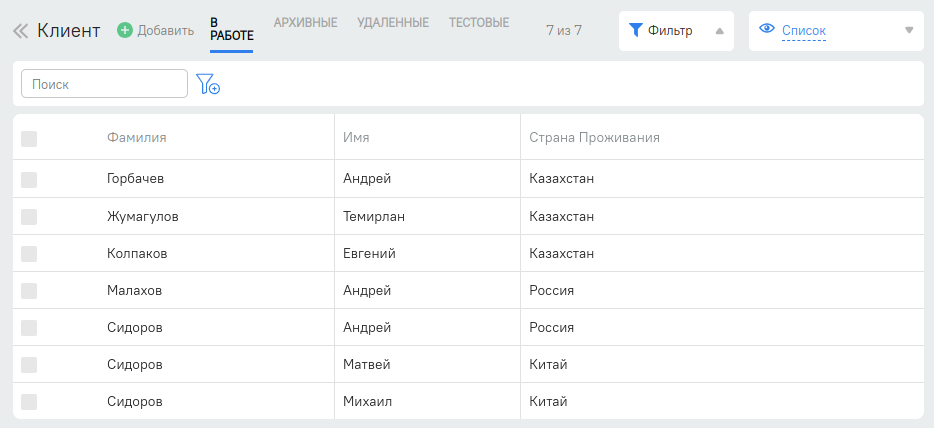 В результате получаем всех клиентов со страной проживания Казахстан: